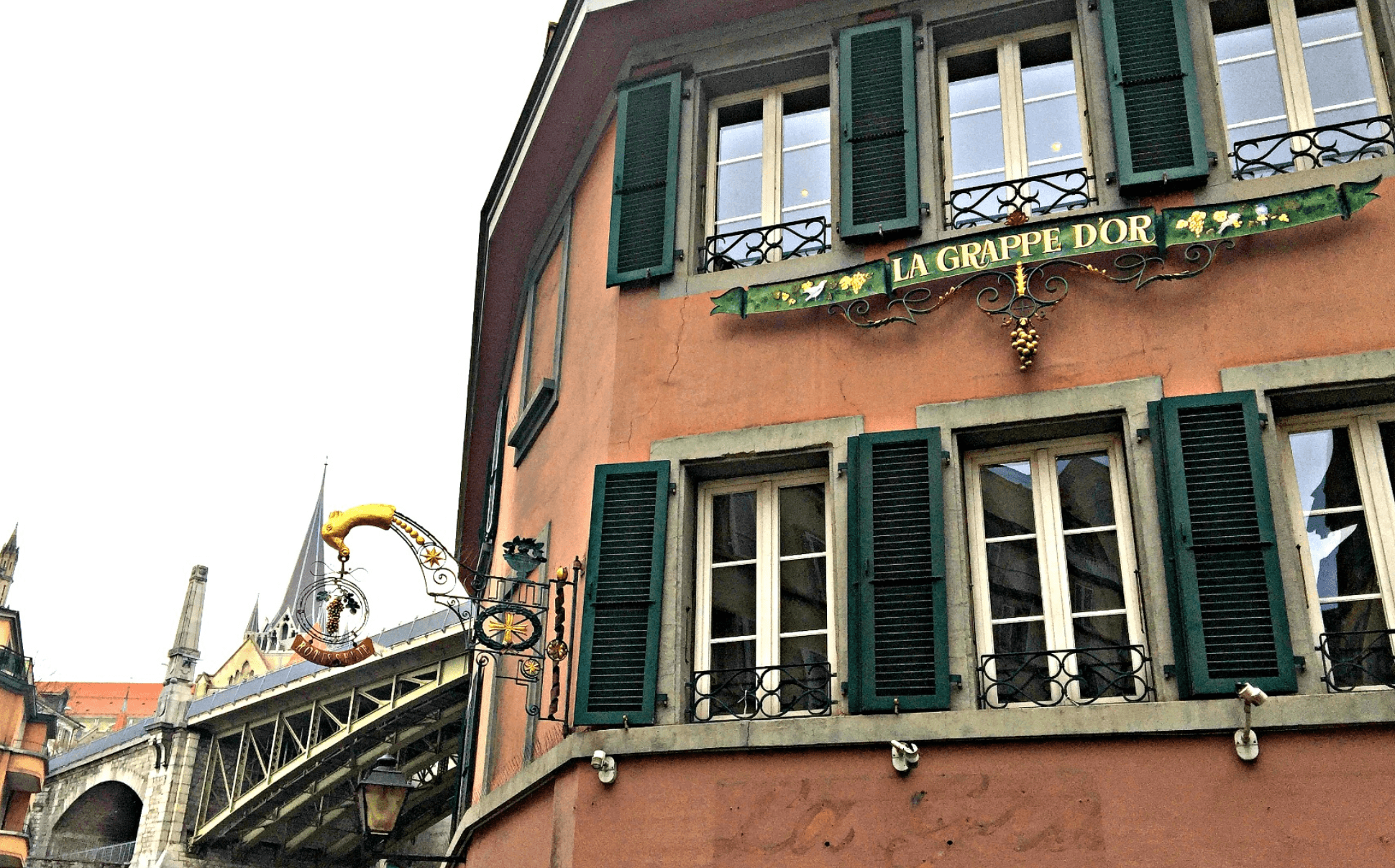 For as long as we’ve lived in Lausanne, we’ve always been charmed by La Grappe d’Or simply for its exterior. The pale pink facade with the gold and green accents is one of the most iconic (and Instagrammable) buildings in the city–nestled at the base of an equally charming cobble-stoned street.