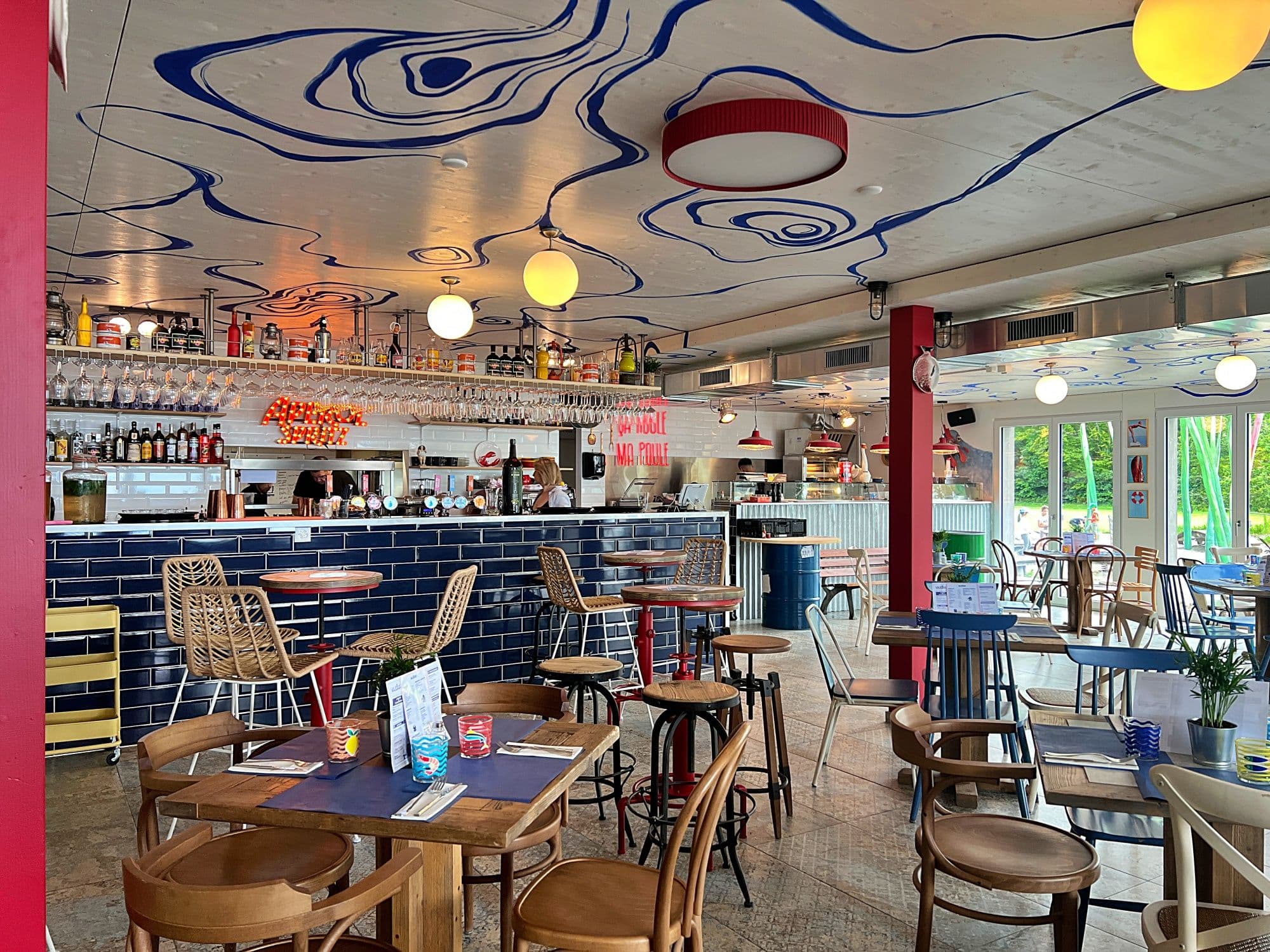 Known for her creative direction for Lausanne’s trendiest establishments, like Un Po’ di Più, La Parada, and Montana’s, and recently being named one of Bilan’s 40 entrepreneurs under 40, Jasmine, along with her right-hand woman Romane Gétaz, have created a space where diners are invited to escape on a delightful visual and culinary journey. With the help of the discerning eye and talent of self-taught artist, Kim Straehler, who does everything from color coding to designing and painting the murals and frescoes on the ceilings and walls, the interior is creative and colorful -- with old fishing boats, and illustrated perch hanging playfully from the wooden beams, it’s one of those restaurants that makes the decision to sit inside or outside difficult. But the expansive terrace on both floors, colorful parasols, and lakeside views beckon you on those sunnier days, perhaps ordering one more Swiss Spritz (made with local Jaya Prosecco and Giselle) too. But being spoiled for choice doesn’t end with the décor.