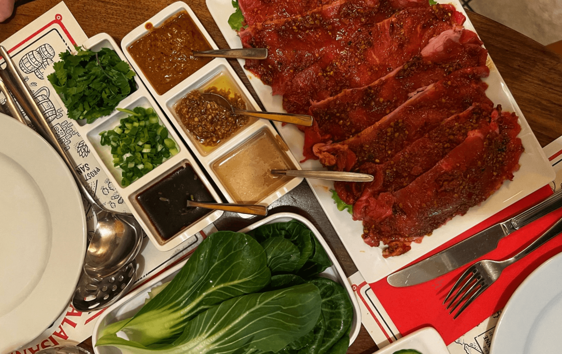 When we told the server that we were there for the Chinese hot pot, she directed us to a set of fixed menus, each with a pre-arranged set of meats and vegetables and a couple choices of bouillons. When we asked her about the white papers that other tables seemed to be ordering from, she smiled and said: “that’s for real Chinese people.” Suddenly our fixed-menu options seemed vaguely insulting.